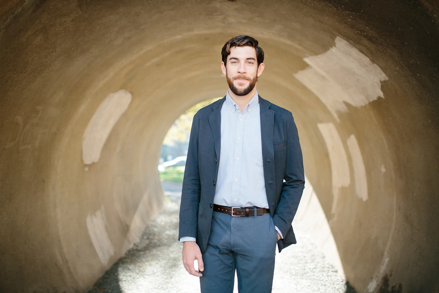 A man in business attire standing inside a concrete tunnel with patches of white paint, outdoors with trees and cars visible in the background.