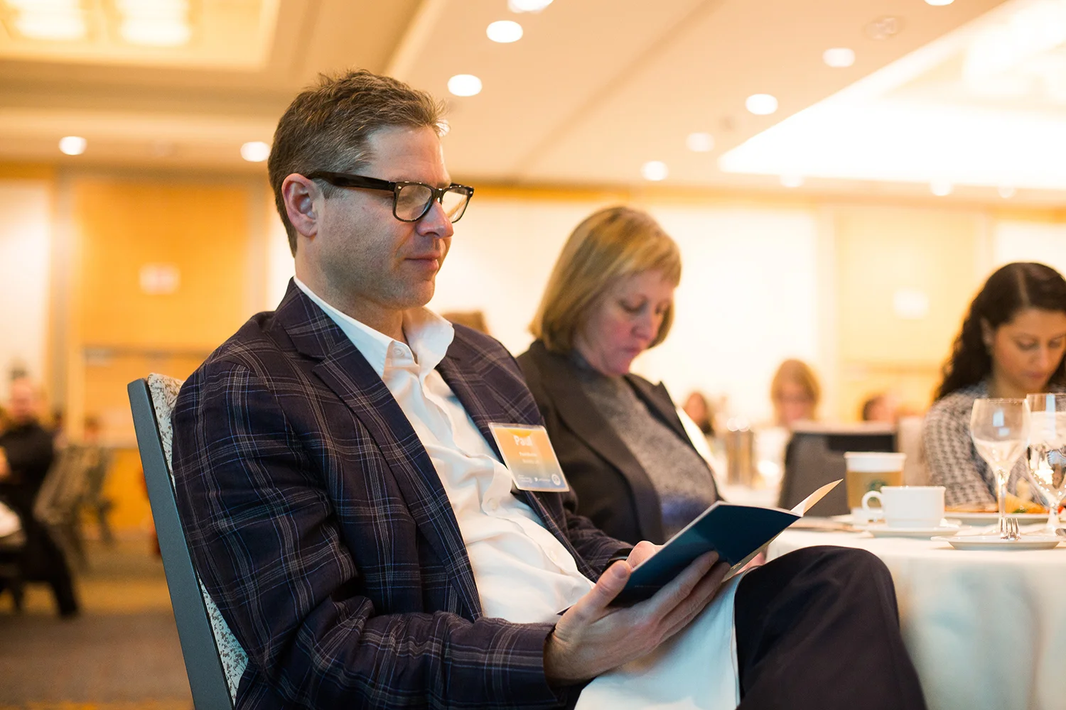 A man wearing glasses and a plaid blazer looking at a booklet during a conference or seminar. Other attendees are seen in the background, seated at tables with drinks.