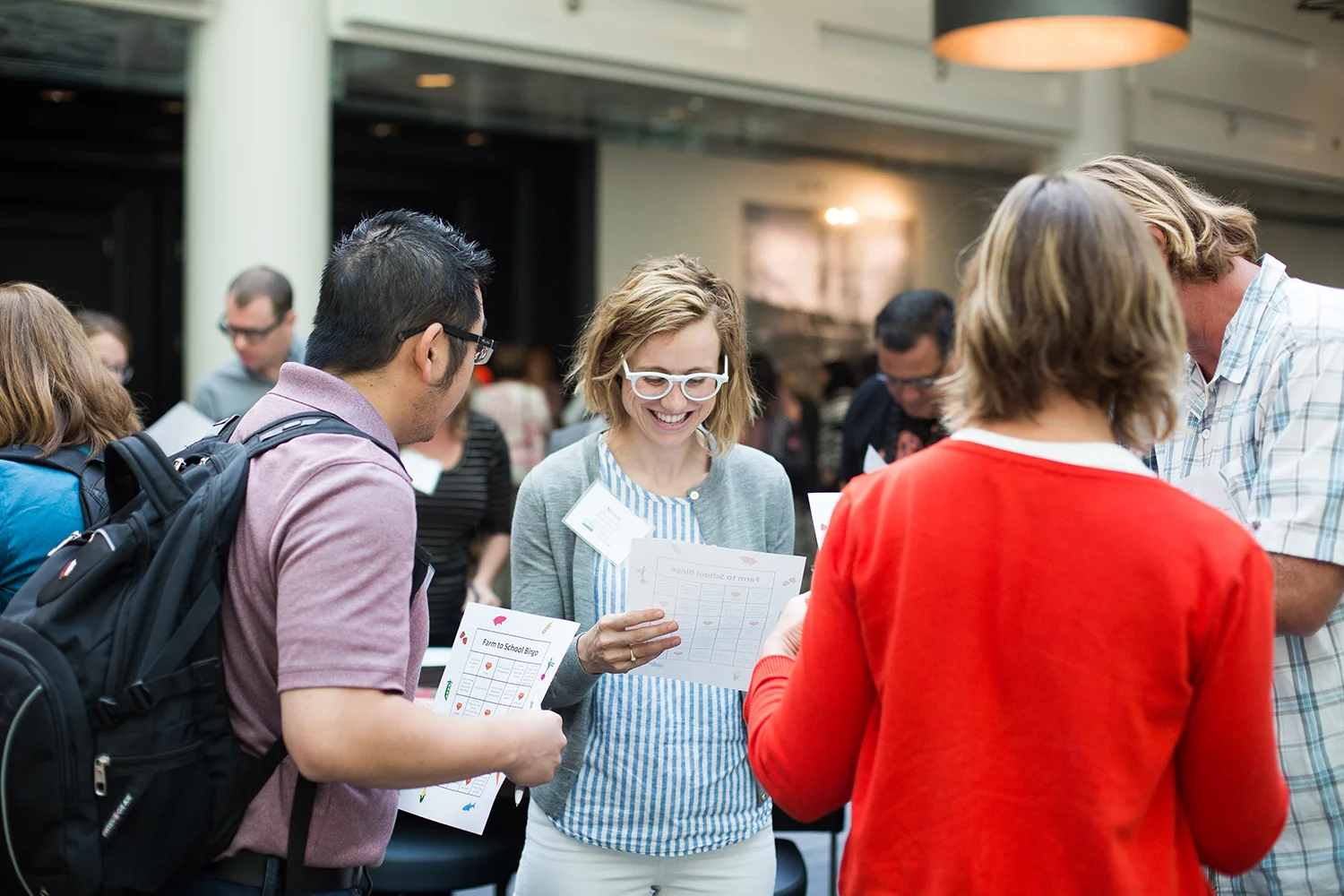 Group of people at an indoor event, talking and holding papers, including a smiling woman with glasses in the center.