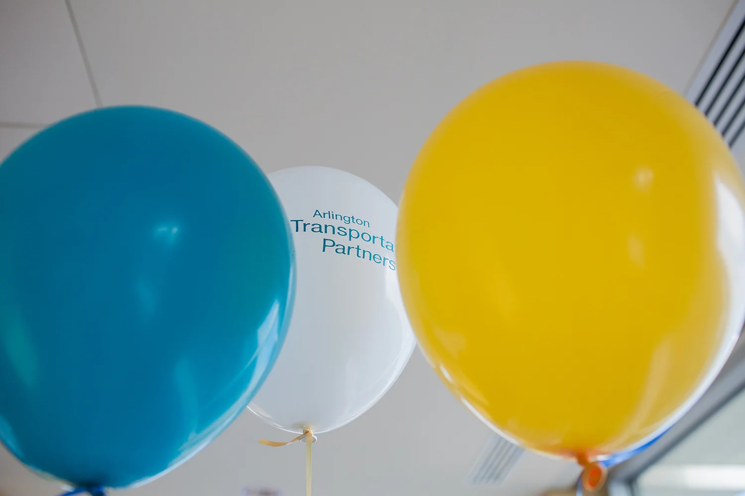 Group of professionally dressed people smiling at a conference or event, standing in front of a backdrop with logos, alongside balloons in blue, yellow, and white.