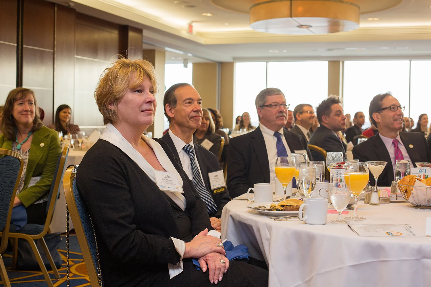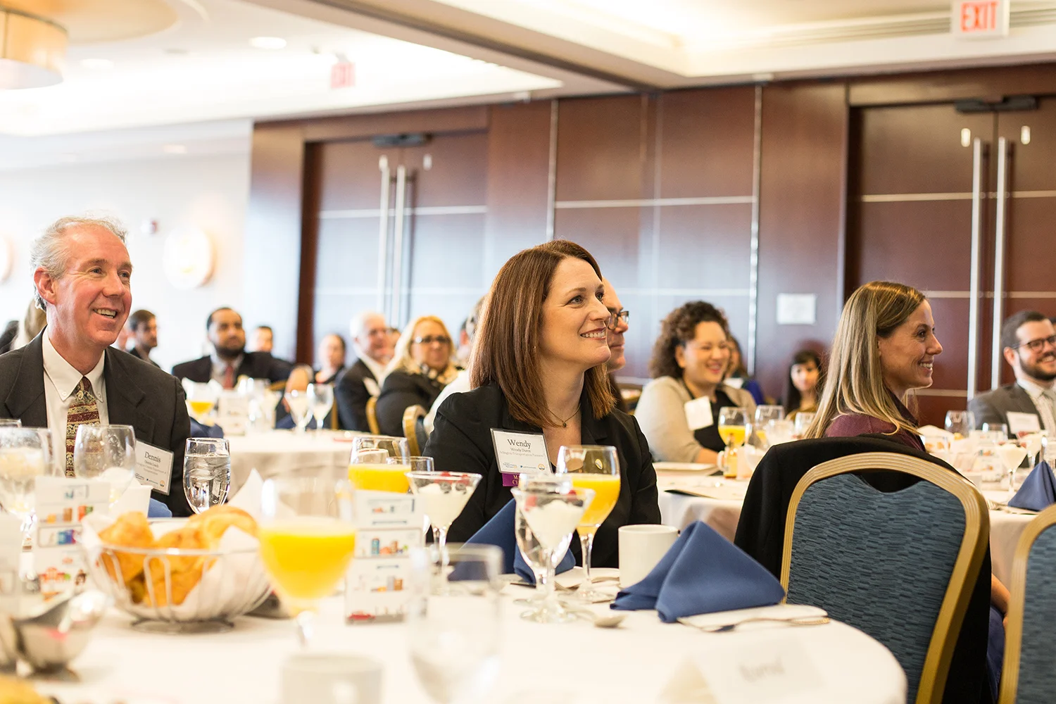 Attendees at a formal conference or breakfast event, sitting at round tables with breakfast foods and drinks, smiling and listening attentively.