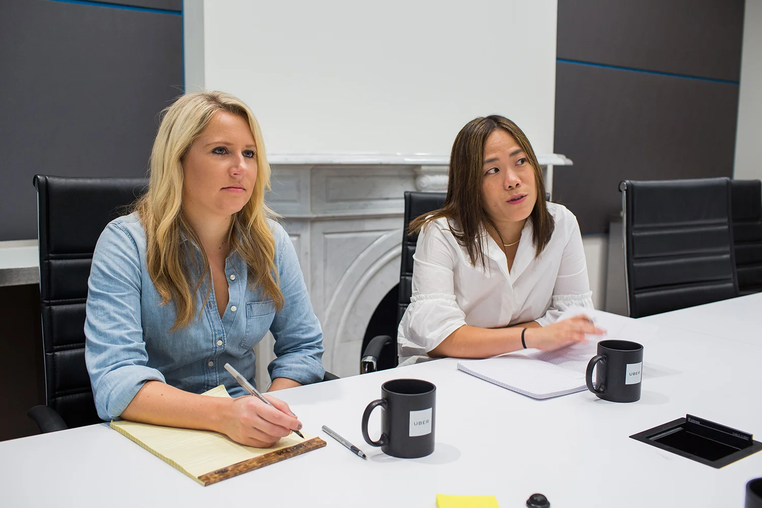 Two women seated at a conference table, engaged in discussion, with notebooks and mugs in front of them.
