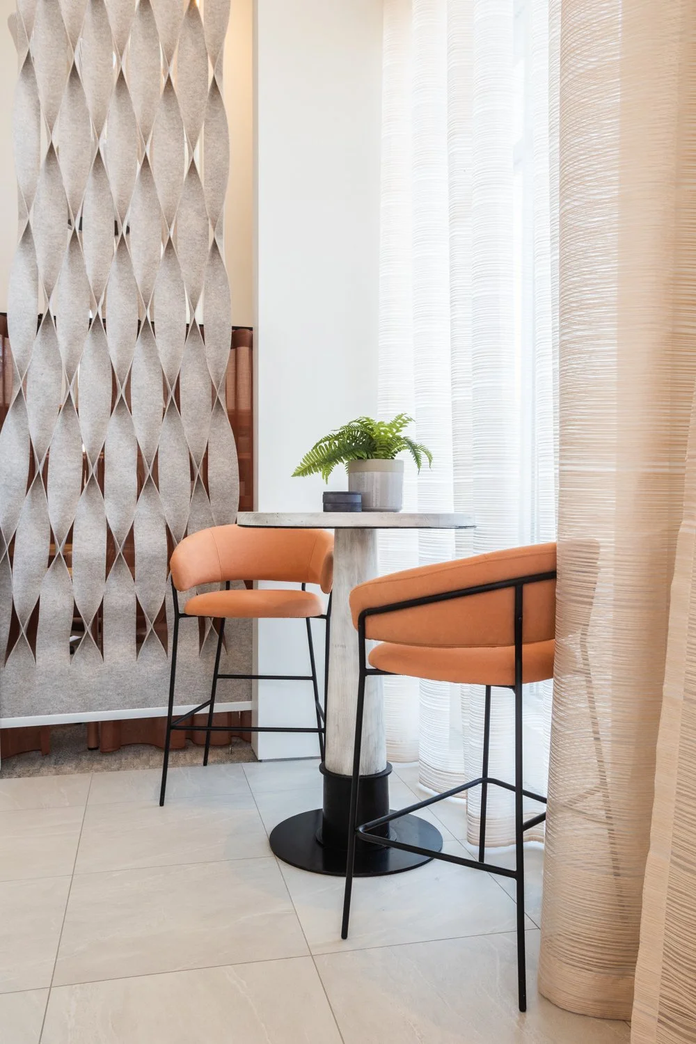 A small seating area with two peach-colored chairs at a round marble table, a potted fern in a gray pot, and sheer curtains letting in natural light, in a modern interior design setting.